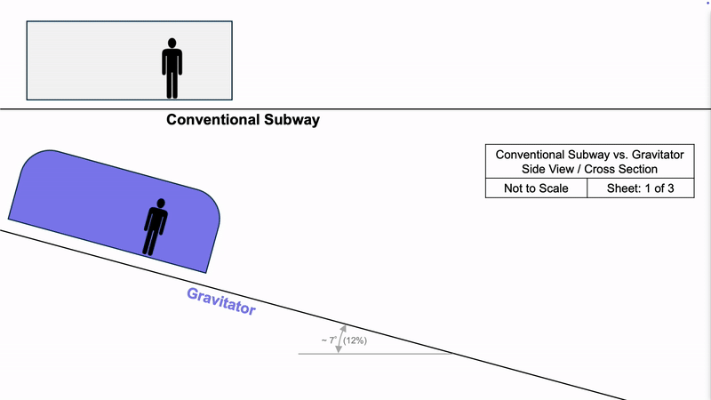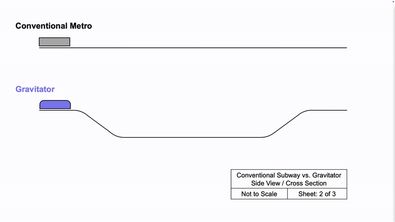Gravitator is a high speed, underground mass transit shuttle, traveling up to 2 miles, in less time than an elevator ride.